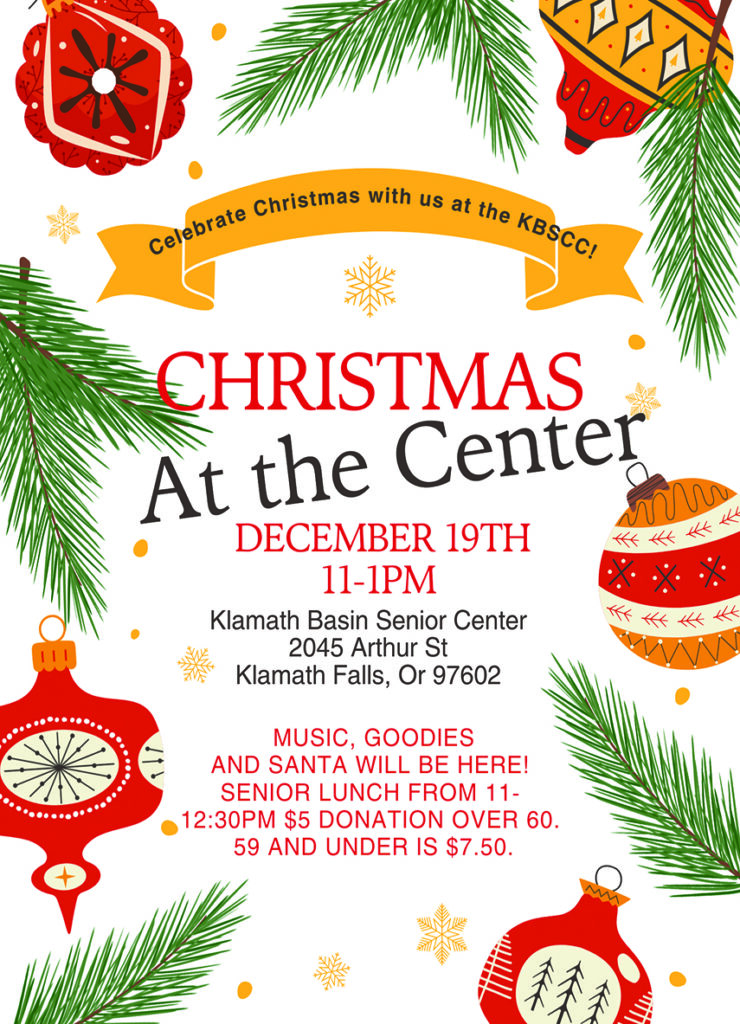 Get ready to step into the holiday spirit at our annual Christmas Bazaar on Saturday, December 6, 2025, from 8:30 AM to 3:00 PM! Join us at the Klamath Basin Senior Citizensā Center, 2045 Arthur Street, for a festive day filled with local vendors, handmade gifts, seasonal dĆ©cor, baked treats, and unique holiday treasures.![]()