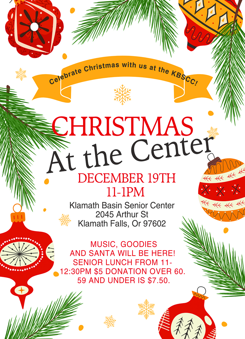 Get ready to step into the holiday spirit at our annual Christmas Bazaar on Saturday, December 6, 2025, from 8:30 AM to 3:00 PM! Join us at the Klamath Basin Senior Citizensā Center, 2045 Arthur Street, for a festive day filled with local vendors, handmade gifts, seasonal dĆ©cor, baked treats, and unique holiday treasures.![]()